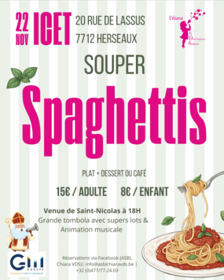 Ce 22 novembre 2025 aura lieu l’annuel souper spaghettis de notre asbl. Au programme :